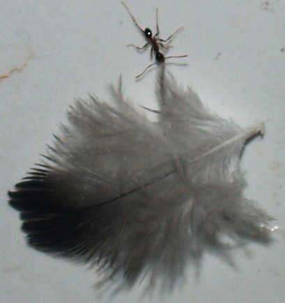 Alors de deux choses l’une : soit mes fourmis sont capables de fabriquer de la poudre de plume ou bien elles utilisent les propriétés isolantes et thermiques des plumes pour protéger la fourmilière avant la mousson ?